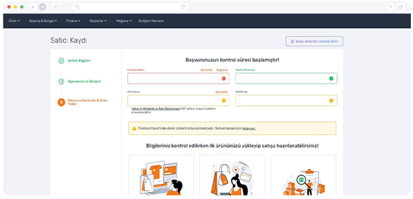 Telefon, e-posta, Mersis ve KEP bilgilerinin doğruluğunu kontrol edin. Bu aşamada Trendyol bilgilerinizi doğrular. |