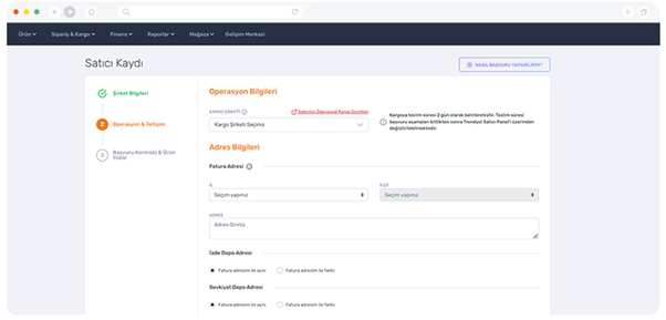 Kargo şirketi seçimi, sevkiyat adresi ve iade depo adresini belirlediğiniz aşamadır. Adresleriniz doğru ve eksiksiz girmeniz elzem.