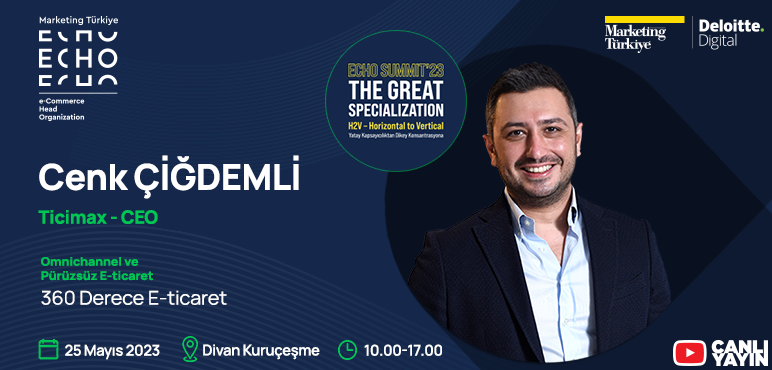 ECHO Summit 23’te bu yıl 9 ana başlık ve 36 alt başlıkta e-ticaret sektörü tüm yönleriyle ele alınacak ve ilgili etkinlikte Ticimax CEO’su Cenk Çiğdemli de "Omnichannel ve Pürüzsüz E-ticaret, 360 Derece E-ticaret" konusuyla konuşmacılar arasında yer alacak.